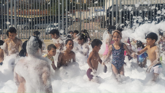Para celebrar que el curso llega a su fin, hemos disfrutado de una gran fiesta de la espuma. Todos han reído, saltado, jugado… ¡y hasta han tomado el sol con sus toallas en la pista como si estuvieran en la playa!
